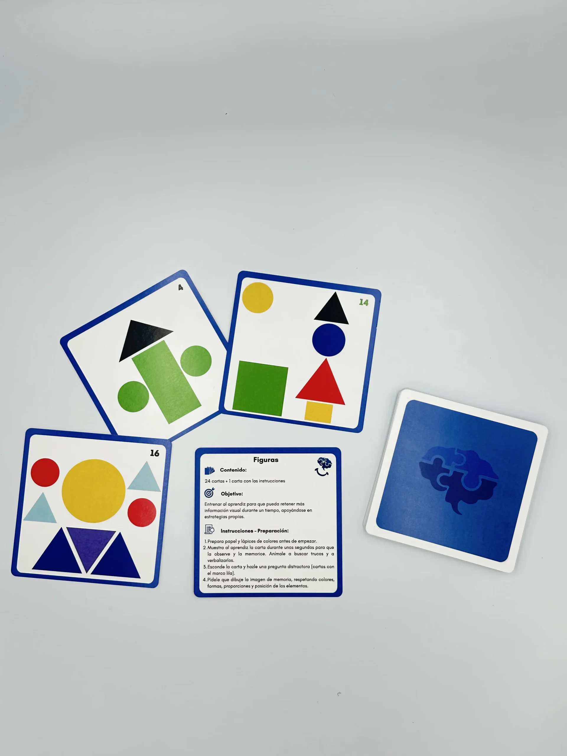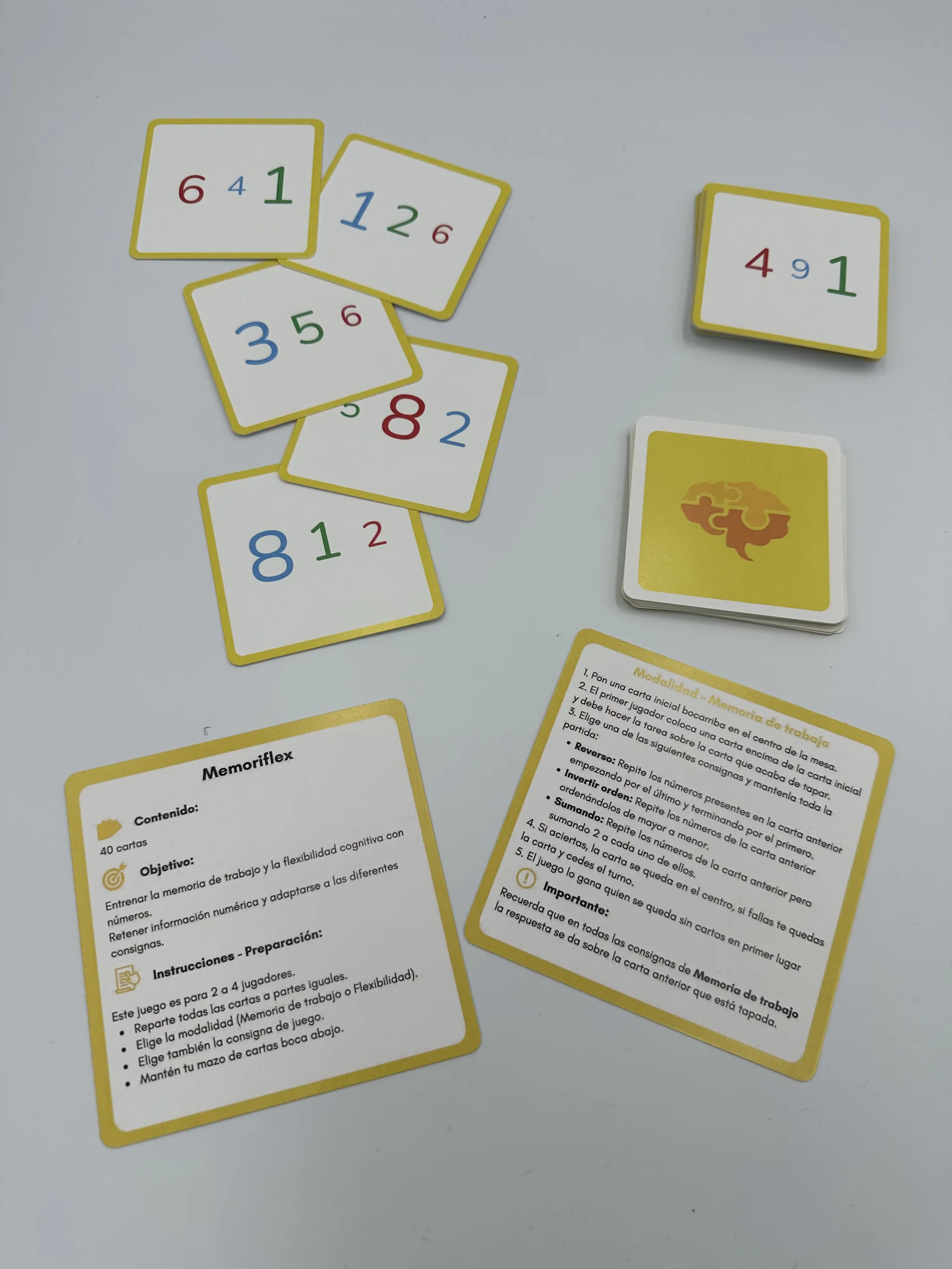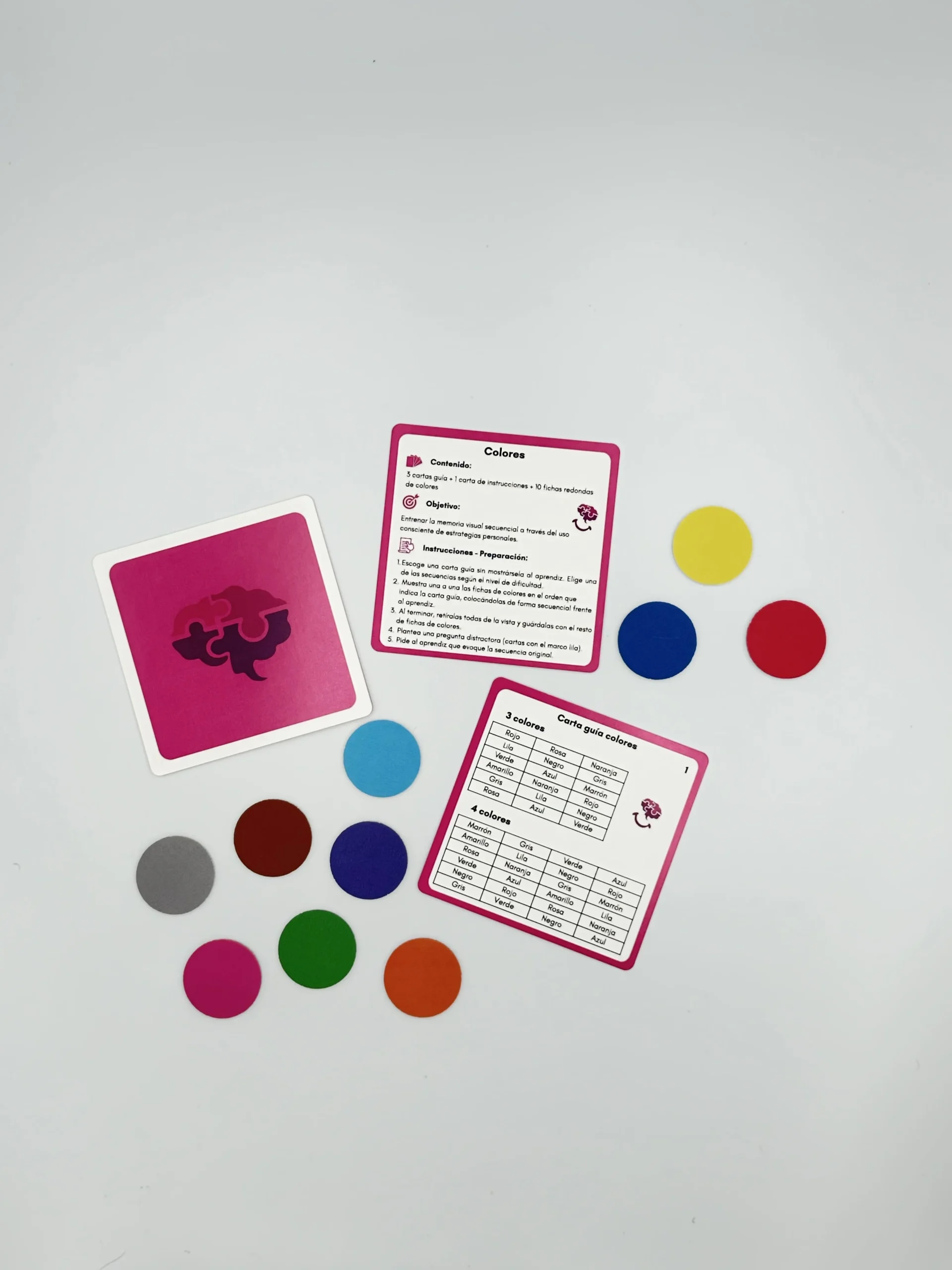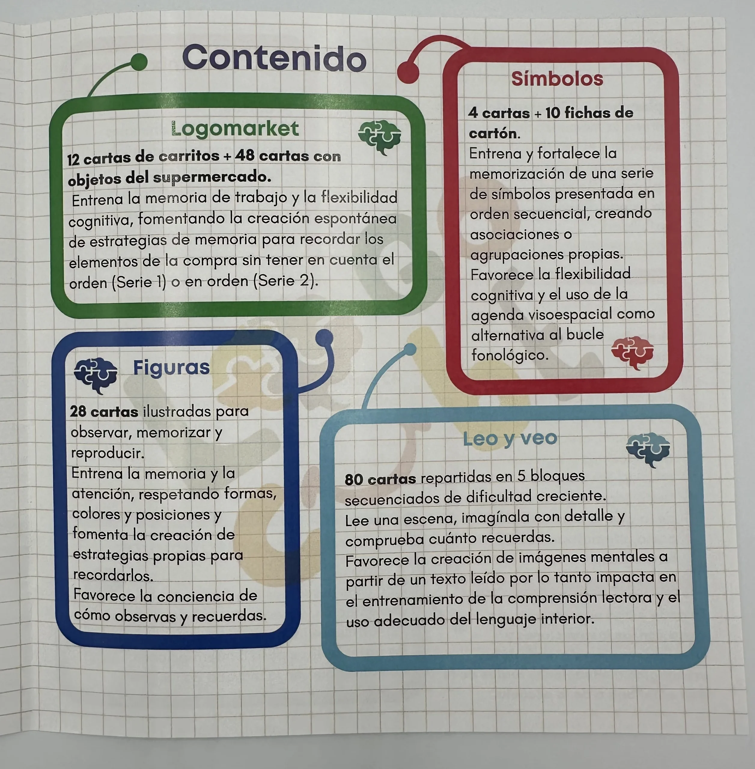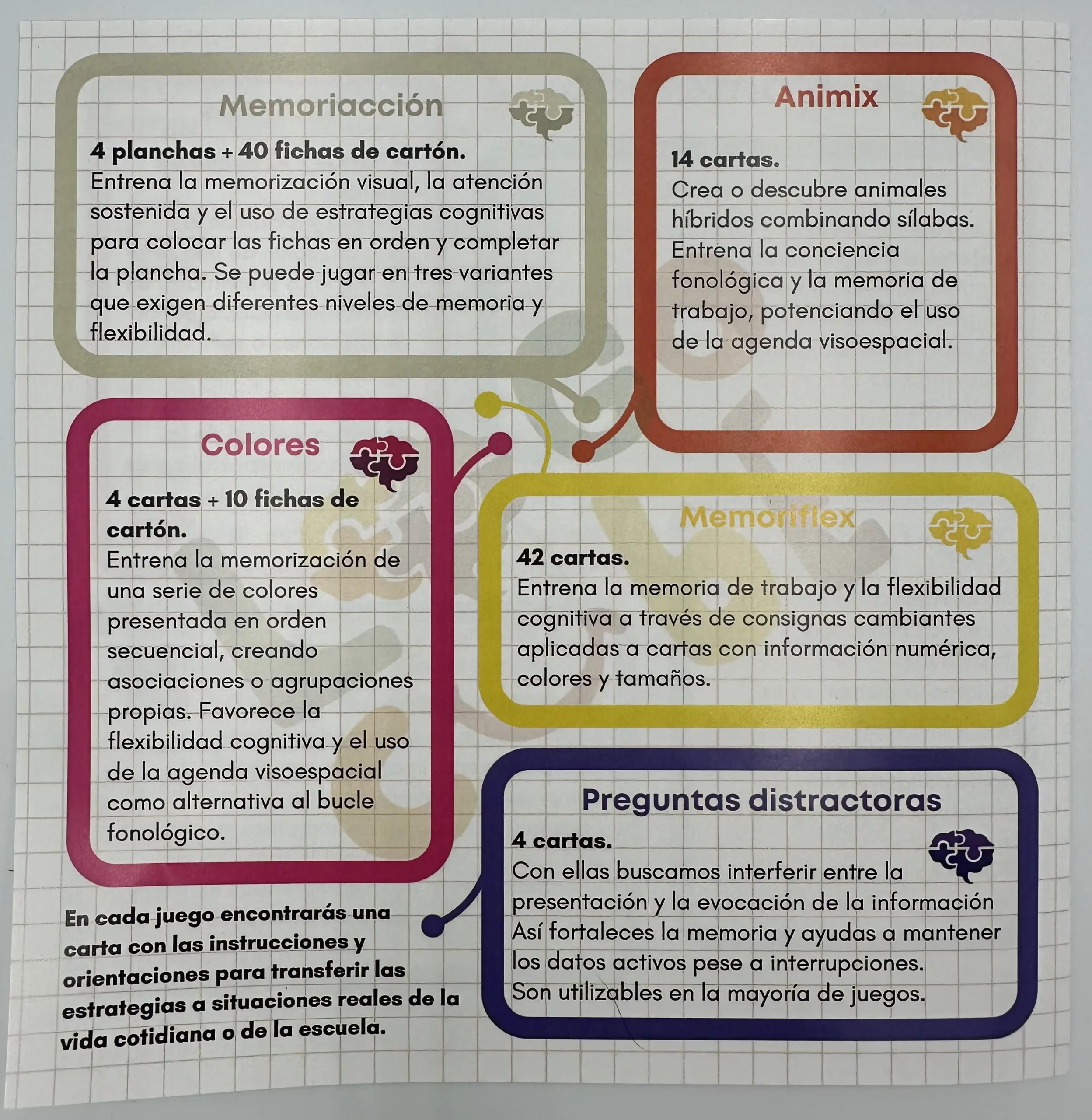 MEMORI-ON es un sistema de materiales manipulativos diseñado para entrenar de forma explícita la memoria de trabajo y otras funciones ejecutivas mediante actividades estructuradas, progresivas y transferibles a contextos reales de aprendizaje. No es un juego aislado, sino un compendio de 8 herramientas integradas en una misma caja.